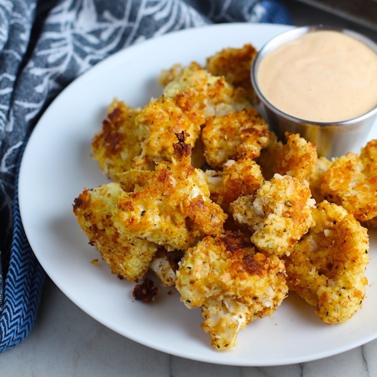 INGREDIENTS – 1 head Cauliflower – 3 large Eggs – 3/4 cup Shredded Coconut – 1/4 cup Panko Breadcrumbs – 1 tsp Garlic Powder – 2 tbsp Parsley – 1/2 tsp Salt & Pepper – 1/2 cup Mayonnaise – 1 tbsp Sriracha Sauce – 1 tbsp Ketchup