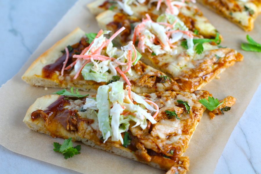Just 15 minutes bake time, then you can add the coleslaw and cilantro over the top before slicing it up and enjoying!