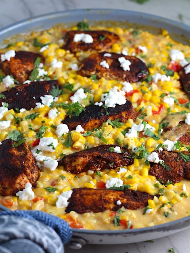 Enjoy using fresh sweet corn when its in season to highlight the latin-flare in this easy dinner recipe. Blackened seasoning revs up the chicken but doesn't over power it with too much heat. This savory dish is rich, creamy but also a touch of sweet that comes from the fresh corn on the cob. The salty bite from the cotija cheese brings the perfect finish to the meal.