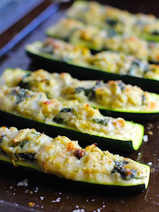 These stuffed zucchini boats can be prepped ahead easily. Then they bake up in about 20 minutes. The ol' classic spinach and artichoke dip whipped up and enjoyed in a zucchini boat is what we're serving today. Packed with veggies, and a little cheese to cover it all, these can be served as dinner, a side dish or an appetizer.