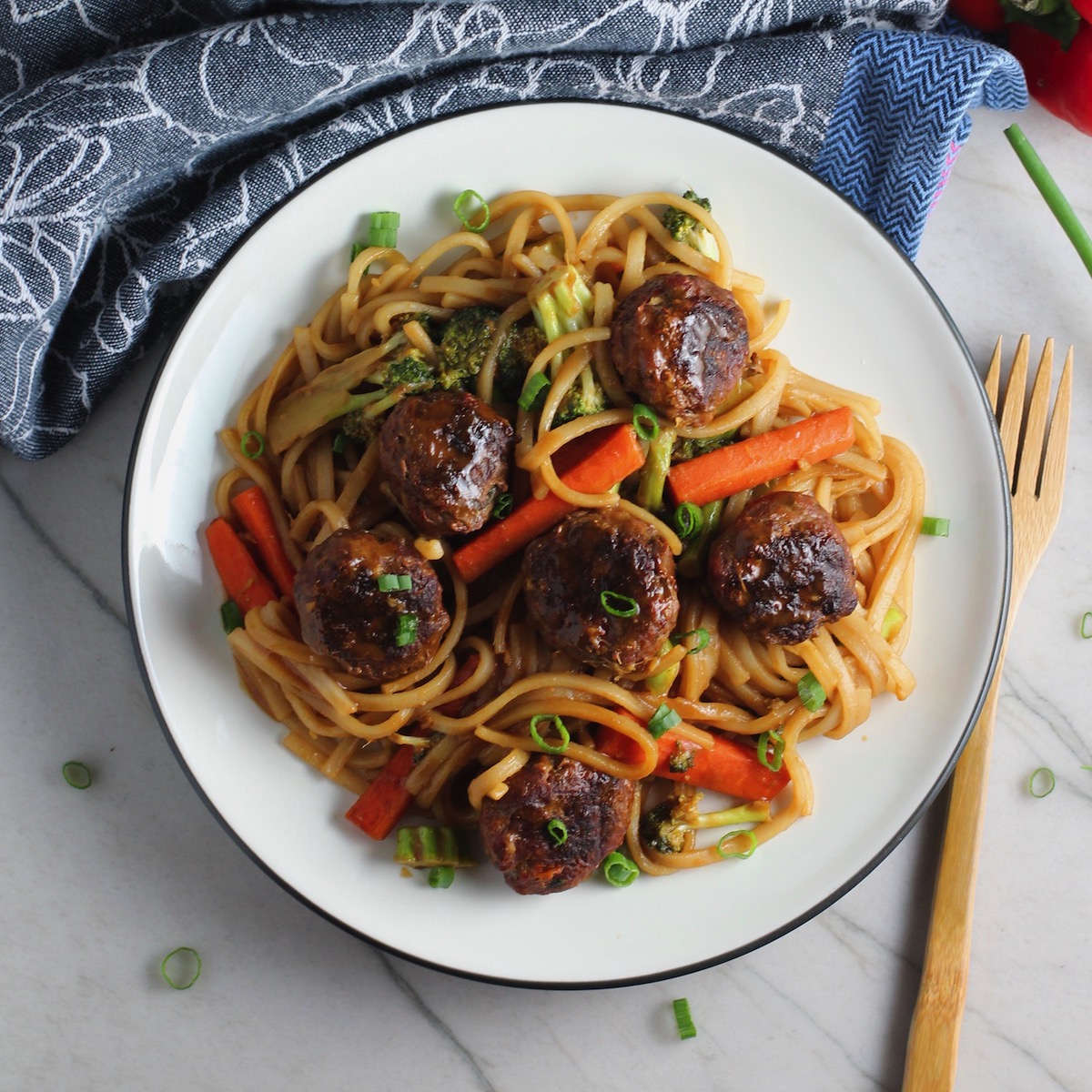 INGREDIENTS MEATBALLS – Scallions – Fresh ginger – Red bell pepper – Chili pepper flakes – Garlic – Soy sauce – Sesame oil – Ground beef – Panko breadcrumbs – EVOO TERIYAKI SAUCE –Teriyaki sauce – Dijon mustard – Sesame oil STIR FRY & SAUCE – Broccoli florets – Carrots – Vermicelli, rice noodles uncooked