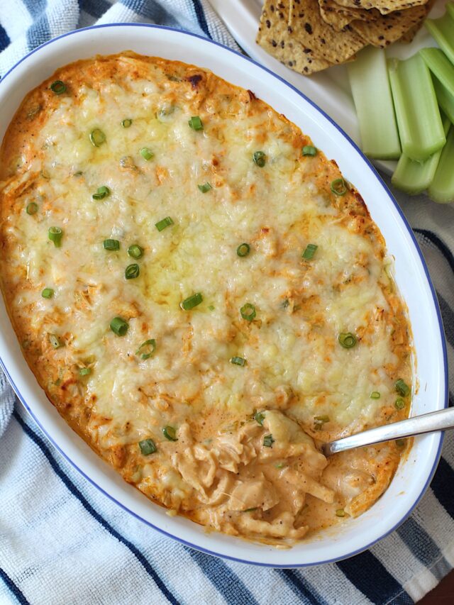 1 lb Chicken Breasts (2 cups shredded) 2 teaspoons Olive Oil 2 Celery Stalks 4 Scallions (green onions) 8 ounces Plain Greek Yogurt 8 ounces Cream Cheese, softened 3/4 cup Buffalo Sauce ¼ cup Blue cheese crumbles 1 teaspoon Garlic Powder 1 teaspoon Onion powder 1 teaspoon Salt, 1 tsp Black Pepper ½ cup Shredded Cheddar Cheese Things to Dip!
